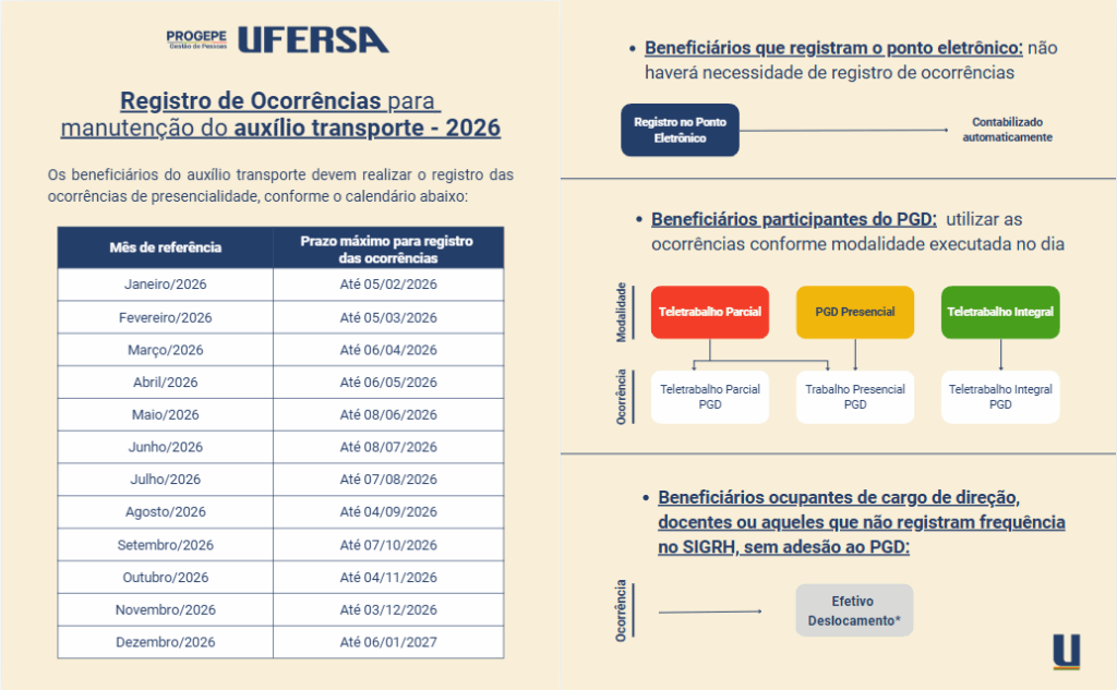 A Pró-Reitoria de Gestão de Pessoas (PROGEPE) informa que, em razão da necessidade de adequação às novas diretrizes do Ministério da Gestão e Inovação em Serviços Públicos (MGI) e da Instrução Normativa SRT/MGI nº 71, de 19 de fevereiro de 2025, a partir de junho de 2025, tornou-se obrigatório o registro da presencialidade para fins de recebimento do auxílio transporte.